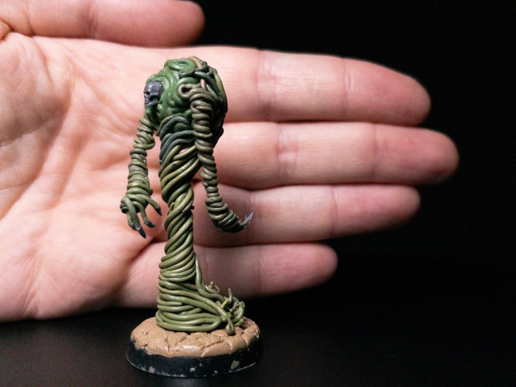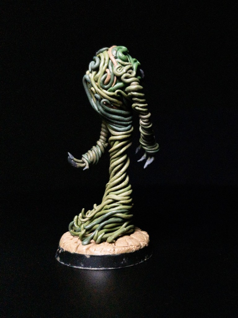 Did I need to do it so carefully, or could I have taken some shortcuts? In retrospect, yes, as it ended up looking bulkier than I believed it would be, but also no, because the slow build up of layers and layers of Greenstuff and Milliput strings helped me to slowly settle for the flow of its body and arms. Despite a more humanoid form, it still feels overall like a flowing being, due to the body being slightly contorted and the arms flowing in sync with it. This dynamic pose was the happy accident of the tedious process.