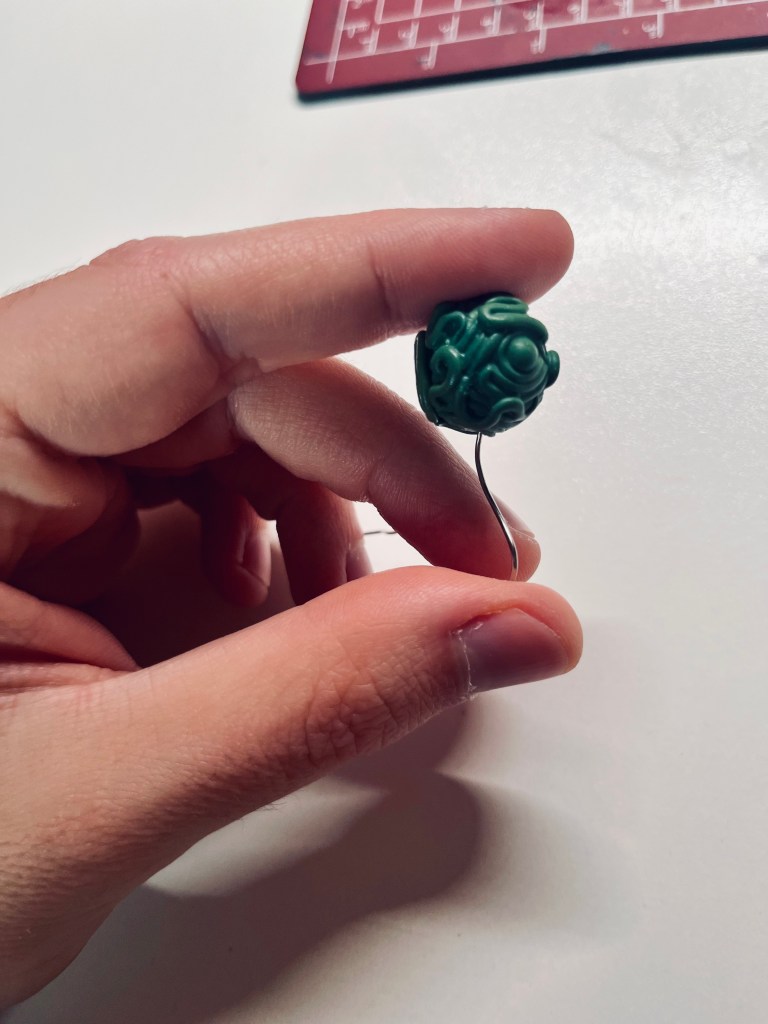 Then came the Lich. Of all the monsters in the Gathering, it should have the closest form that would resemble something humanoid, while still remaining a weird, writhing, tentacly mess, with all the wrong proportions. While thinking about how to sculpt this, I even came up with my own head-canon and lore, why the Lich is the way it is, but that’s for another blog post. I took one of the bootlegged demon heads, and found a perfect spot to drill a dent into it, and glue a single skull into it. Then putting that “skull-ball” again on a bent paper-clip, I started slowly building up the form, layer by layer.