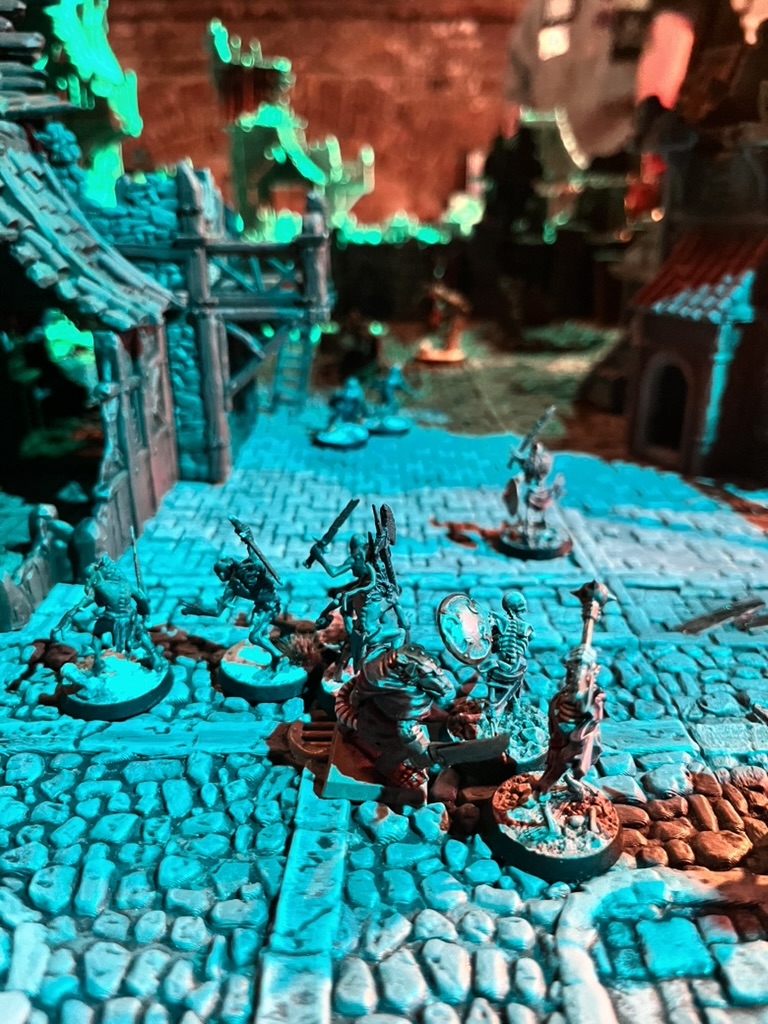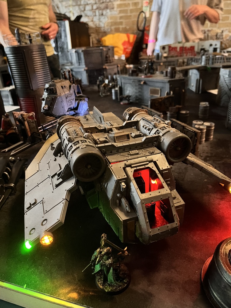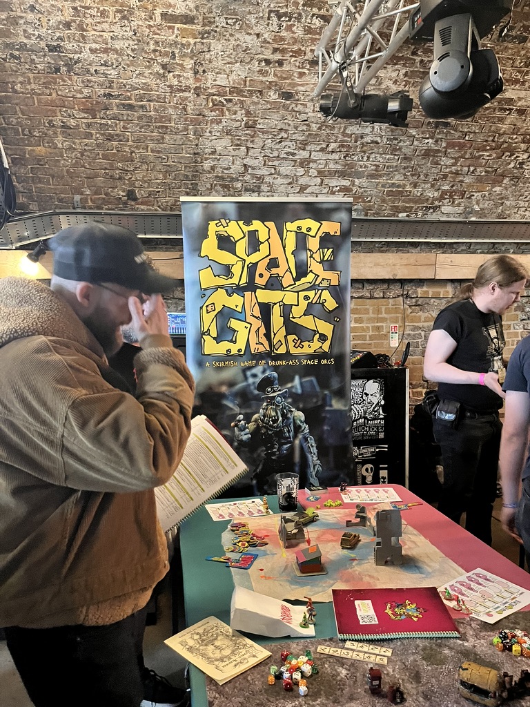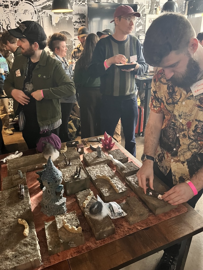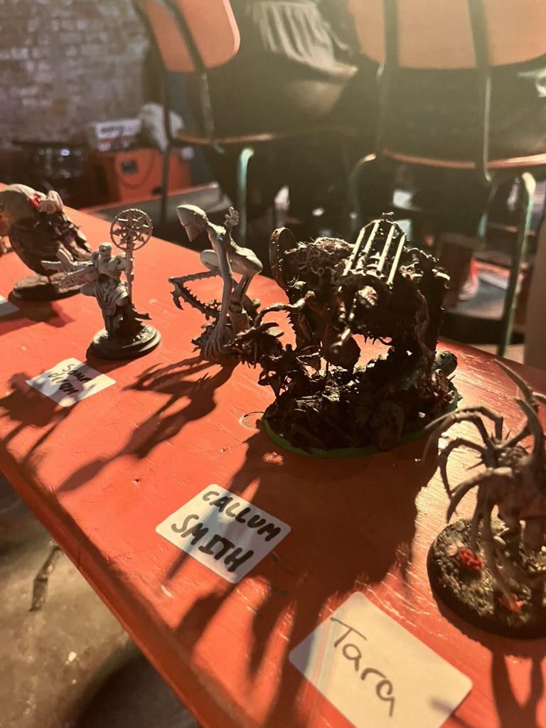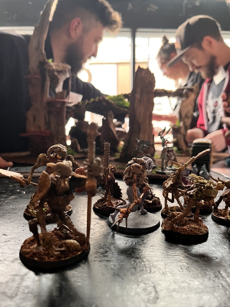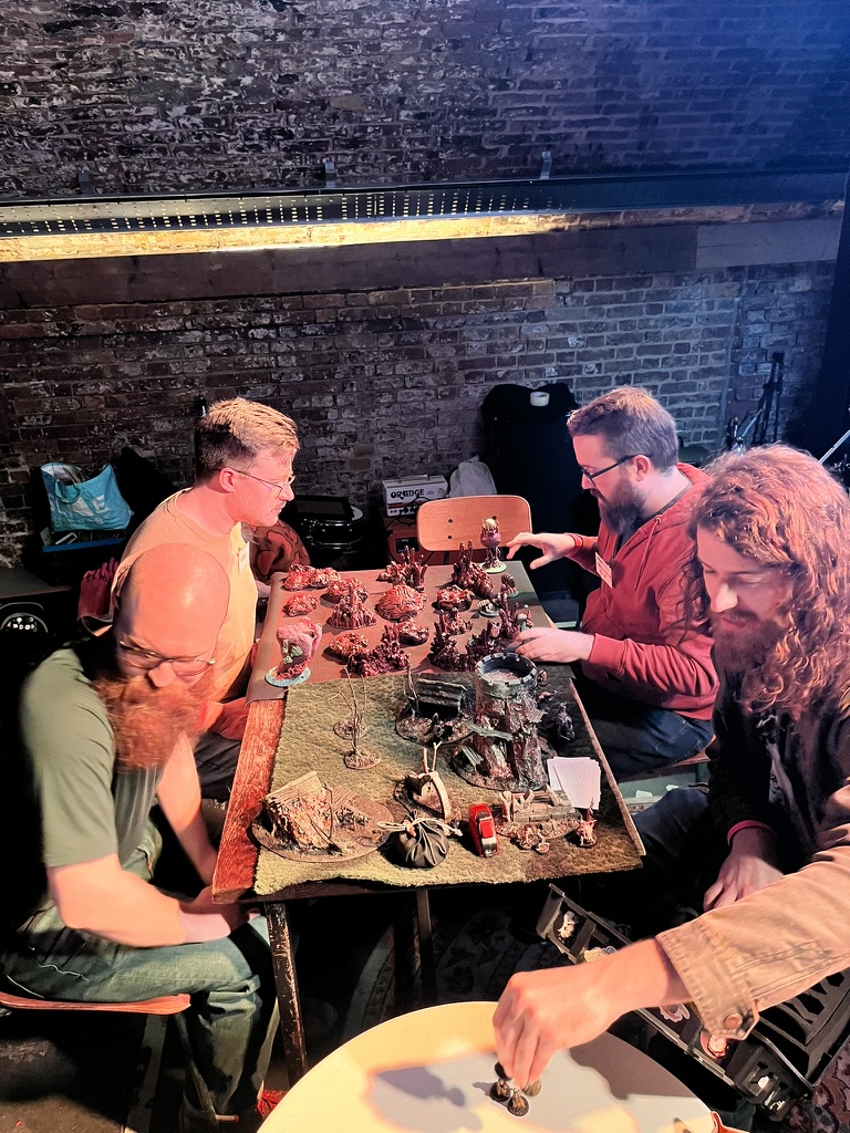 Come evening, the demo games and scheduled games took over. The games I remember being shown and played on dedicated tables: Fae by @fae_miniatures, Haemorrhage by @implausibleknight, Space Gits by @crikeymiles, Aetherpunk28 by @narcoleptic_wizard, Hollowlands by @second_dawn_miniatures, Malignant Flesh by @manglingminis, and a massive PvE Mordheim game on an absolutely stunning board and ambient green lighting. The narrative of the game was set within a Vermintide scenario, with all players trying to reach the other side of the board while being overwhelmed by Skaven, round by round. Closing the night was a loose painting & kitbash competition, where Jon (@by_bolter_and_blade) and Dave (@damp_dog) had the insane challenge to judge the mad creations and paintjobs of all submissions.